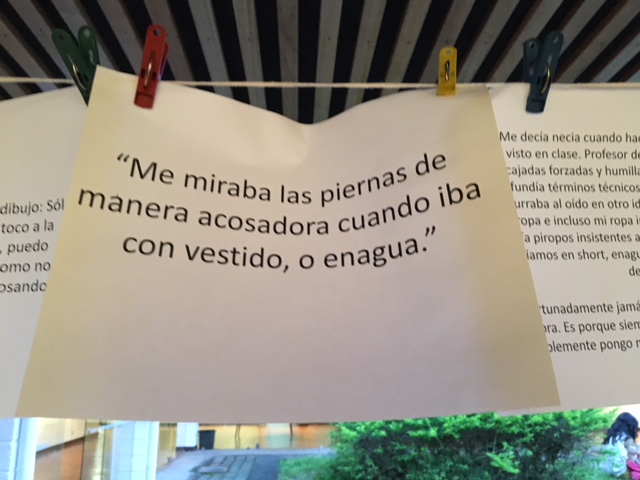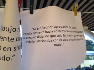 Eran carteles que denunciaban acoso, frases sexistas que las estudiantes hacían públicas de ese modo, una forma de denuncia social, la visibilización de una manera de violencia sexual en esa Facultad. Uno de los carteles decía: “Un profesor me dijo que estaba delgada, pero que aun así estaba rica”. En otro se podía leer: “Un profe de dibujo me escribía en la madrugada para decirme “qué linda que estás en tu foto del WhatsApp”. Y pareciera que no ha pasado nada. Hasta habrá personas que piensen que es imaginación de las chicas.