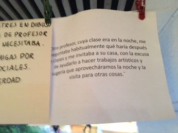 Las fotos que ilustran este artículo me las envió una amiga a finales del año pasado, muestran varios carteles pendiendo de un alambre, a modo de exposición, en pasillos de la Facultad de Bellas Artes. Los colgaron agarrados con prensas para ropa. Encontré simbolismo en la imagen de ropa tendida. Ropa que lavamos para que sea vista, ropa a la que quitamos lo sucio, o algo de lo sucio.