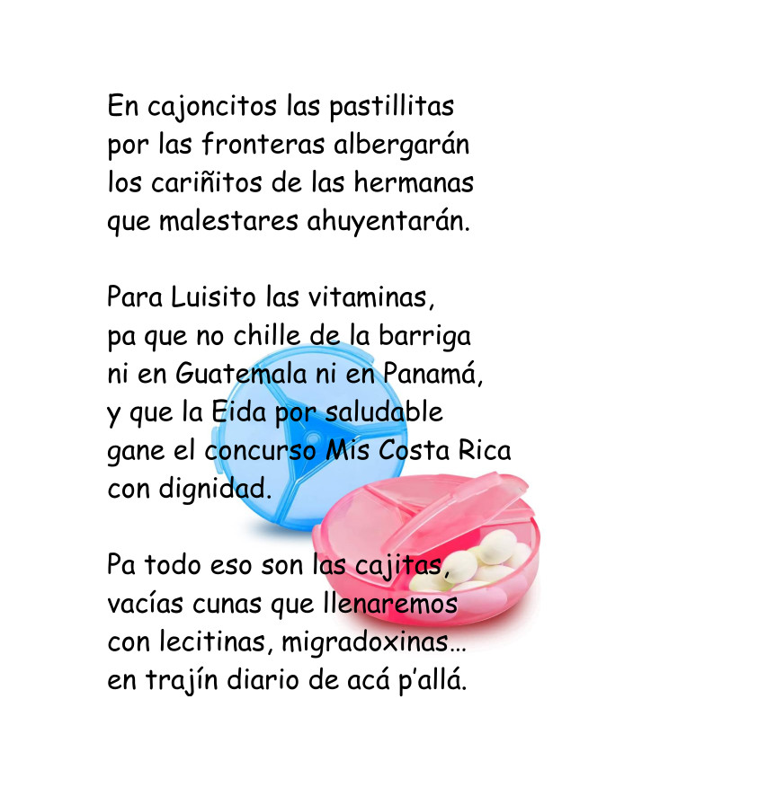 Dedicado a mi hermana Ileana (1947-2011) que me dio el primer pastillero para llevar en el bolso. San José, 21 de febrero de 2007.