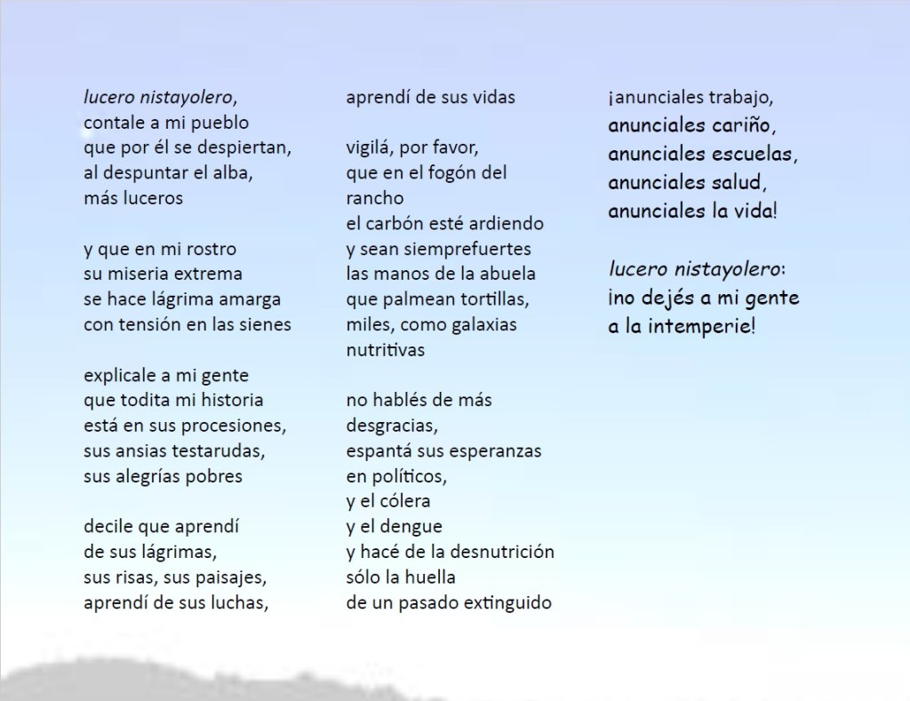 Lucero nistayolero Posted on 12 enero, 2024 por la cualquiera Responder Escrito el 19 de octubre de 1995, a las 10 de la noche Nixtayolero es una palabra de origen nahuatl. Significa estrella de la mañana o lucero del amanecer. Ese lucero que acompaña al Sol en su resurgir, cuando amanece, es el planeta Venus.