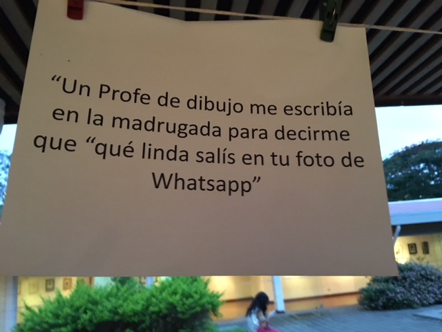 Las fotos que ilustran este artículo me las envió una amiga a finales del año pasado, muestran varios carteles pendiendo de un alambre, a modo de exposición, en pasillos de la Facultad de Bellas Artes. Los colgaron agarrados con prensas para ropa. Encontré simbolismo en la imagen de ropa tendida. Ropa que lavamos para que sea vista, ropa a la que quitamos lo sucio, o algo de lo sucio.